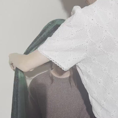 המטפחת מבד קטיפה צרובה בפרחים בצבע ירוק בקבוק, בצורת מלבן ארוך לקשירת כיסוי מלא. בראש המטפחת שרשרת מהממת ליצירת מראה מינימלי אבל עם מתוחכם.
